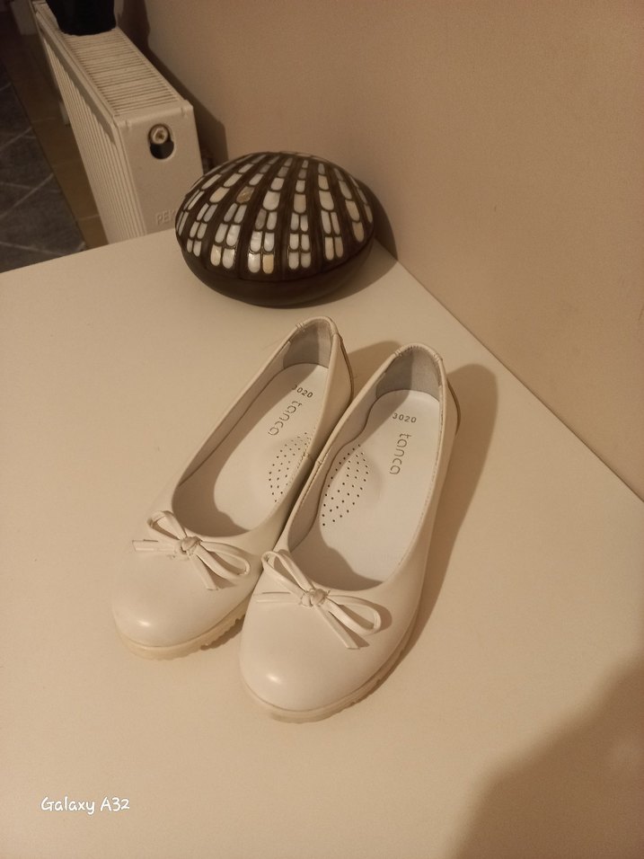 Beyaz renkte, fiyonk detaylı çocuk babet. Ic dis deridir hic kullanilmadi.