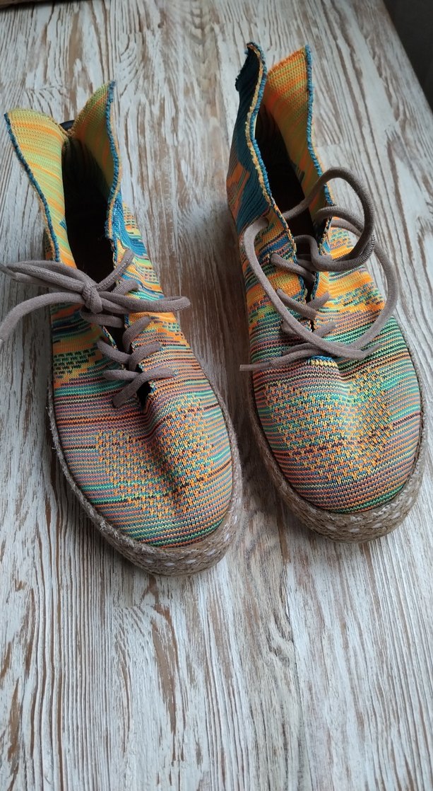 Renkli örgü kumaştan, bağcıklı ve dolgu topuklu, bohem tarzda espadril.Acayip rahat yumuşak.