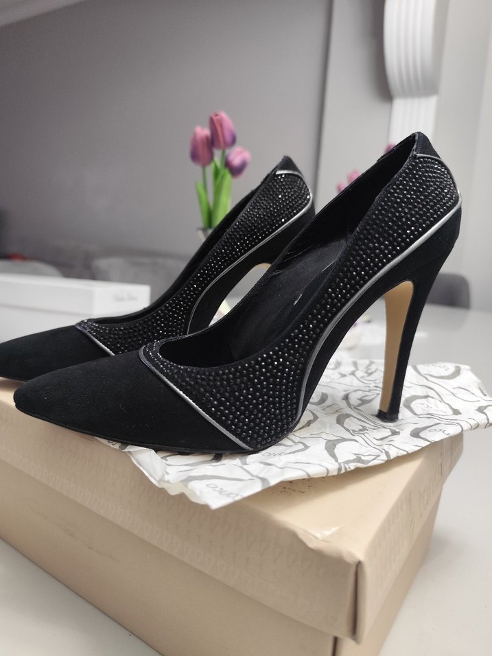 Kemal Tanca Orjinal deri süet stiletto. Sadece ofiste giyildi. iyi durumda. 38 numara. Siyah süet malzemeden yapılmış, koyu yılan derisi desenli ve tokalı, modern klasik stilettolar, ofis kullanımı için uygun.Orjinal kutusunda toz trbasi ve yedek topuk ucu ile gönderilecektir.