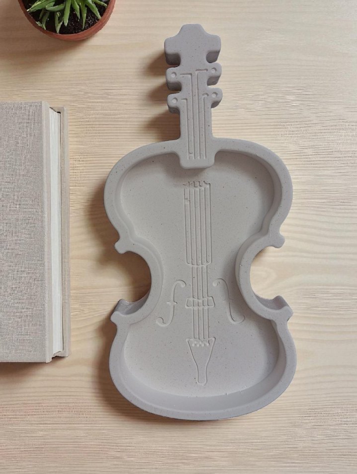 Keman şeklinde, pürüzsüz malzemeden yapılmış gri dekoratif tepsi, küçük eşyalar için uygun.