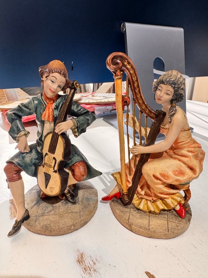 Keman çalan erkek ve arp çalan kadın figürleri, vintage tarz kıyafetler içinde, koyu ve camel tonlarda detaylı tasarlanmıştır.