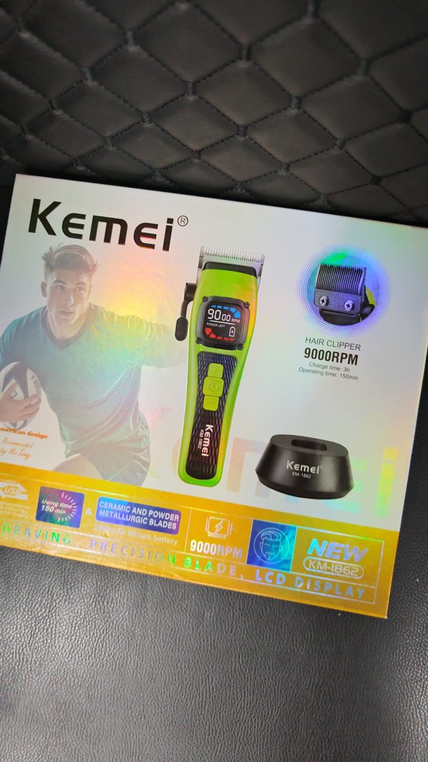 Kemei saç kesme makinesi, 9000 RPM motor, seramik ve toz metal bıçaklar, LCD ekran ve canlı yeşil renkle kesimde hassasiyet sunar. ⏱️