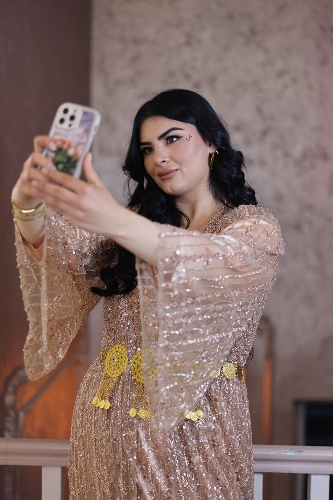 Uzun, v yakalı ve etnik desenli bu bol kesim altın renk elbise, parıltılı detaylarıyla bohem aşiret düğünleri için uygundur . ✨