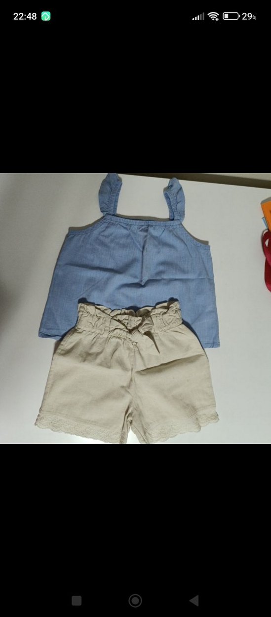 Salaş kesim bebek kız takımı, kemerli bej alt ve yumuşak denimden gri askılı üst içerir. spor rahattır