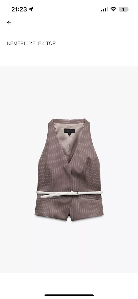 Kemer detaylı, bej renkli, kısa kesim kadın yelek. Kolsuz ve keskin yaka tasarımıyla ofis veya günlük kullanıma uygun.