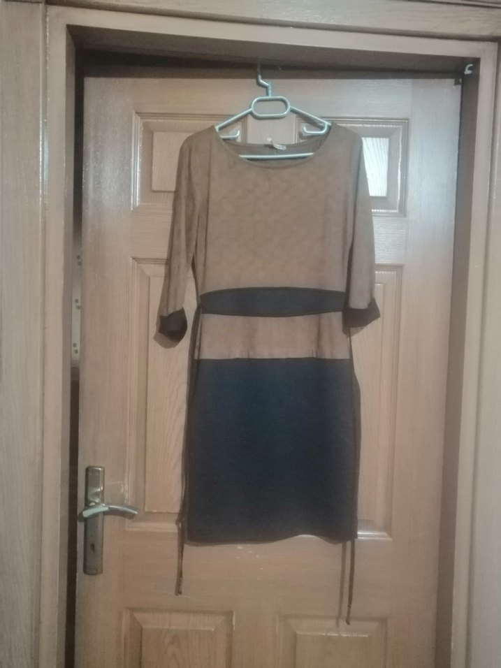Bej renkli midi elbise, uzun kollu ve yuvarlak yaka tasarımıyla kemer detayı içerir. Günlük kullanıma uygun, şık ve rahat bir modeldir.