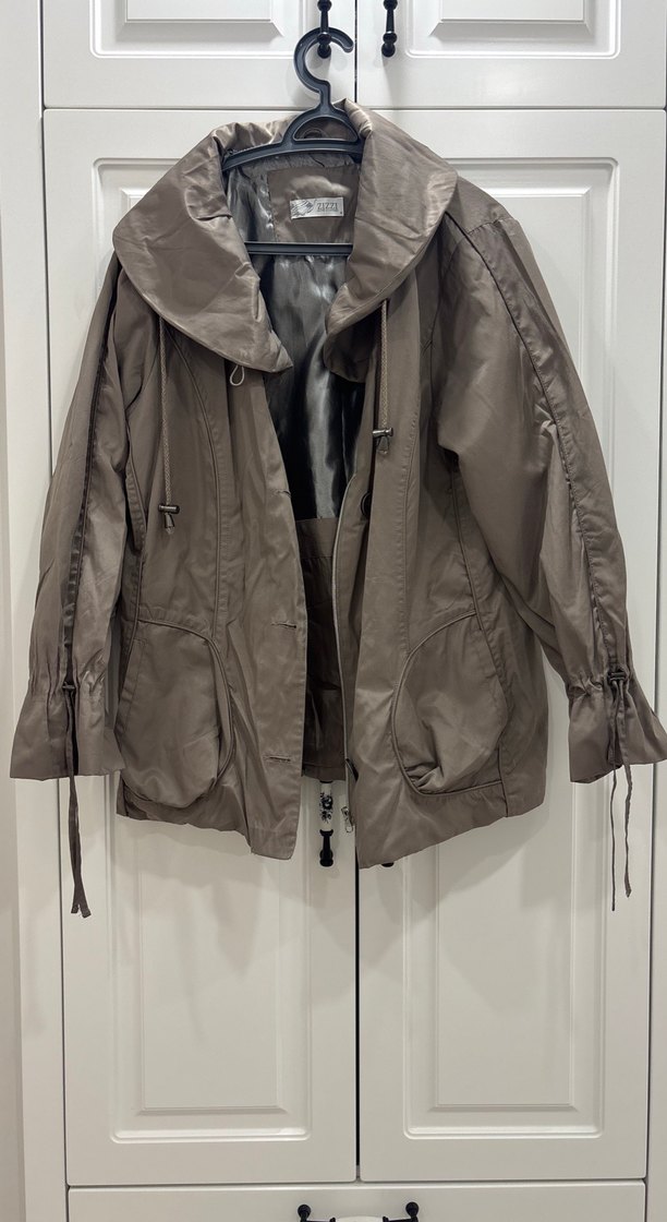Kemer detaylı, bol kesim bej kadın ceketi. Notlu yaka ve ip detaylı kolları vardır. Sentetik kumaştan, midi boy ve dış mekan için uygundur.