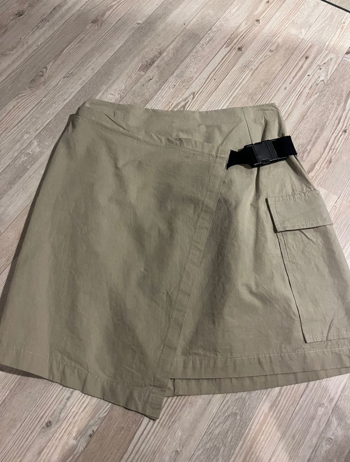 Kemer detaylı, bol kesim bej mini etek, yumuşak keten kumaştan. Sade ve rahat tasarımıyla dış mekan kullanımı için uygundur.