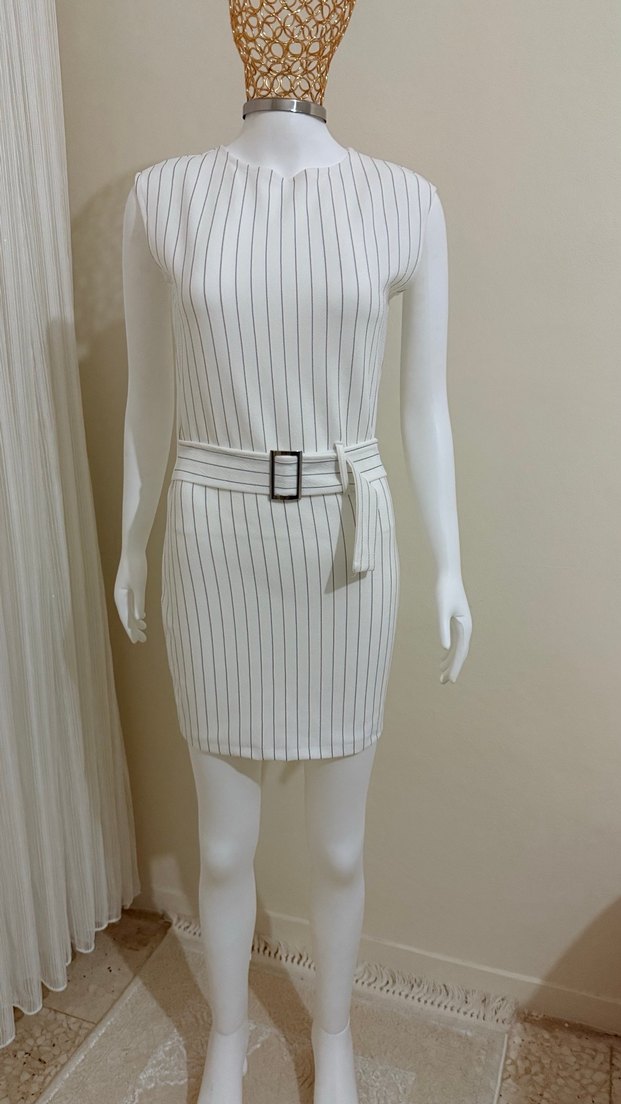 Beyaz renkli, ince çizgili, kemer detaylı, kolsuz mini elbise. Tekne yaka ve regular fit kesime sahip. Ofis için uygun, ipek kumaştan yapılmıştır. Lacivert rengi de mevcuttur