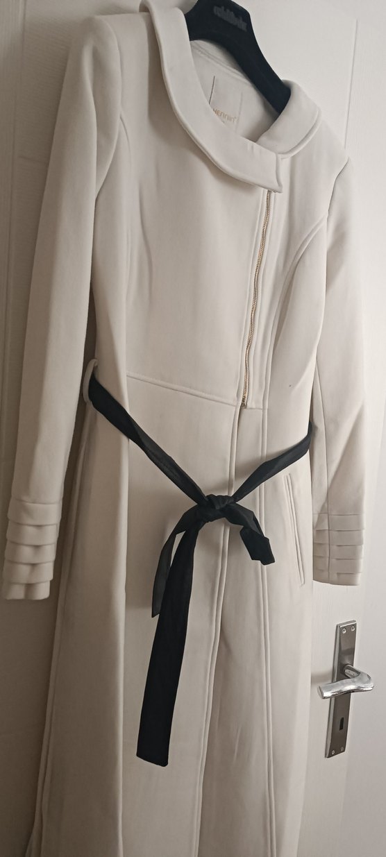 beyaz renkte, önden fermuarlı ve belinde siyah kemer detaylı kaban. Kollarında şerit dikiş detayları bulunur. cok az kullanildi iki üç defa...