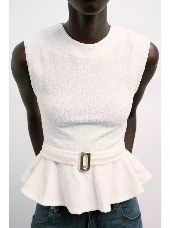 Beyaz, kolsuz, kemerli ve mini boyda, dar kesim yelek. Yuvarlak yaka ve peplum etek detayıyla sokak modasına uygun.