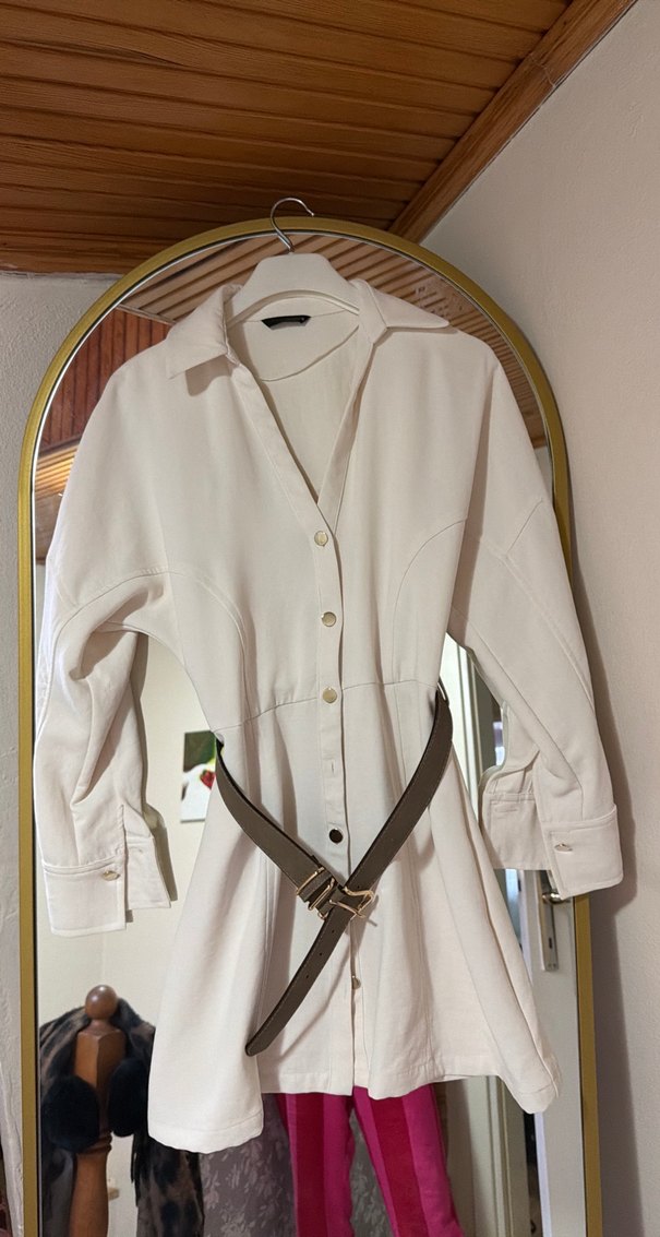 Kemer Detaylı Beyaz Midi Keten Gömlek