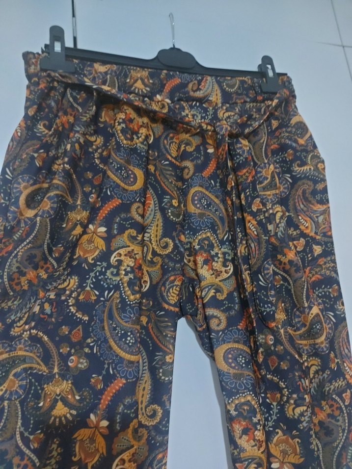 Kemer detaylı, çok renkli bohem desenli, sentetik kumaştan yapılmış, bol kesim kısa kadın pantolonu.