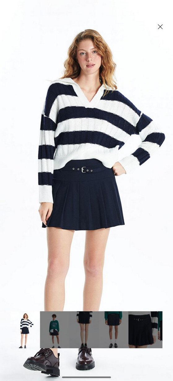 Pamuklu kumaştan, uzun kollu ve yakalı, bol kesim kadın triko. Kemer detaylı, beyaz ve koyu renk çizgili tasarım. Günlük rahat kullanım için ideal. Şort etek
