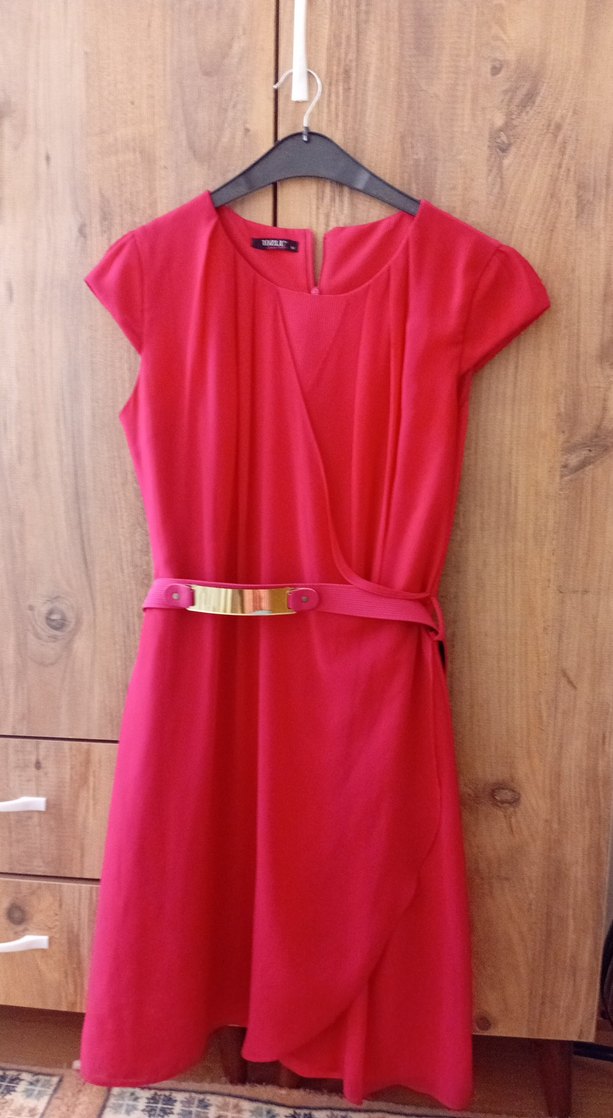 Kemerli, V yaka, kısa kollu kırmızı midi elbise. Modern klasik tarzda, romantik akşamlar için uygun bir tasarım.✨