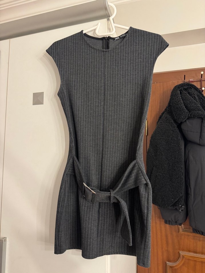 Zara Kemer detaylı, çizgili gri renkli, kolsuz ve vücuda oturan mini elbise.