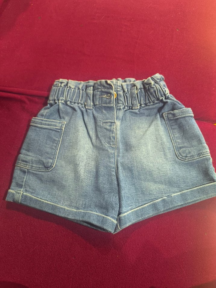Geniş kesim, kemerli bel ve büyük ön ceplere sahip gri denim kız şortu, rahat sokak stili için uygundur.
