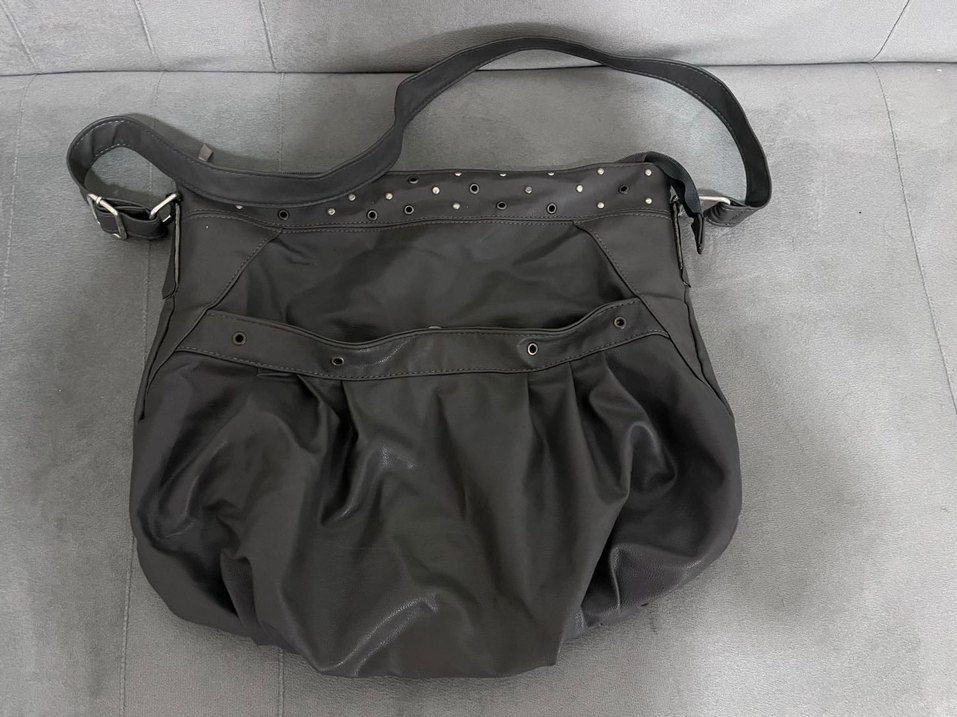 Gri deri kadın çanta, kemerli tasarımı ve metal halka detaylarıyla gotik ve sokak stilini yansıtıyor. Günlük kullanıma uygun.