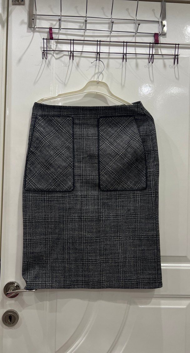 Gri ekose desenli midi etek, kemerli ve iki büyük ön cepli, sentetik kumaştan, regular kesimle ofis için uygun.