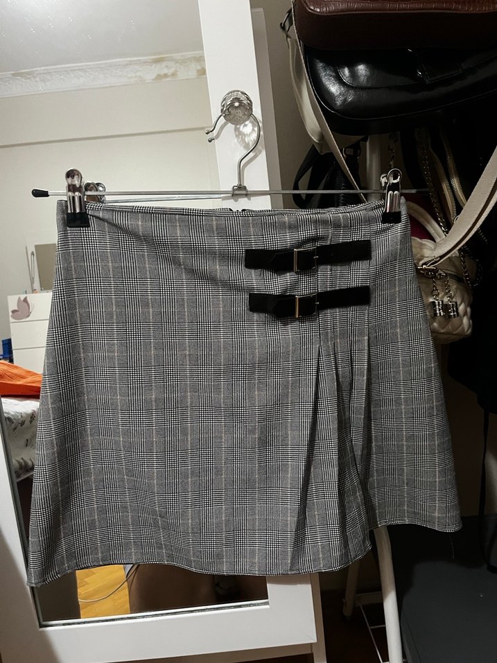 Kemer Detaylı Gri Ekose Mini Etek