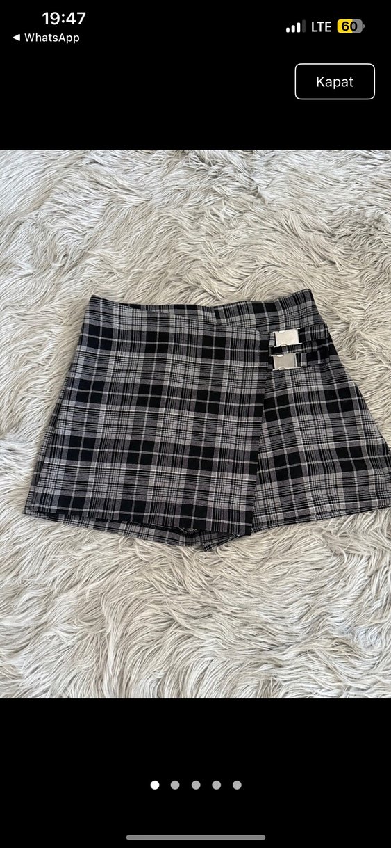 eni 41 cm boyu 40 cm . hic kullanilmadi. Gri ekose desende, kemerli kısa ve bol kesim mini etek. Yumuşak sentetik kumaştan üretilmiş, günlük kullanım için uygundur.