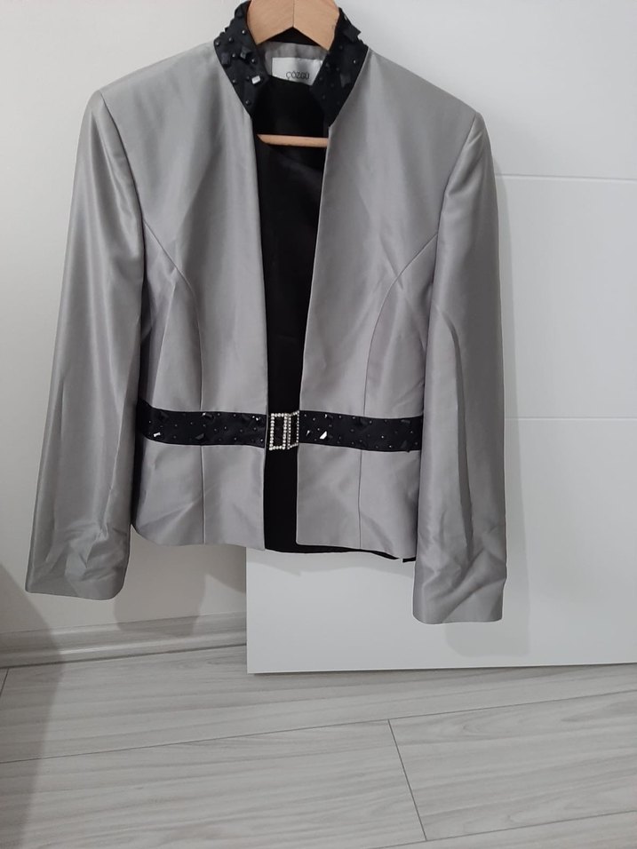 Gri renkli kadın blazer ceket, kemer detaylı ve kesimli yakaya sahiptir. Sentetik kumaştan üretilmiş, normal kesim ve askılı kolludur. Ofis için modern tarzda uygun bir parçadır.