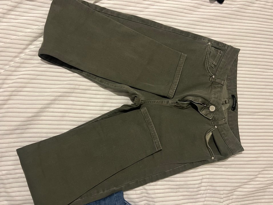 Kemer detaylı, fitted kesim haki renk denim pantolon. Normal uzunlukta midi boyu ve düz deseniyle günlük rahat sokak stiline uygundur.