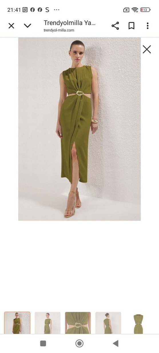 Kemer detaylı, kolsuz, haki renk uzun elbise. İpek gibi kumaştan, regular fit ve ön yırtmaçlı, romantik akşamlar için uygun. Trendyol Milla