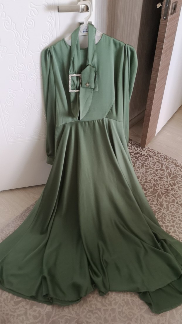 Kadınlar için kemerli, yakası kesik uzun saten elbise. Parlak haki renkte, ince askılı ve klasik modern tarzda, düğünler için uygun.