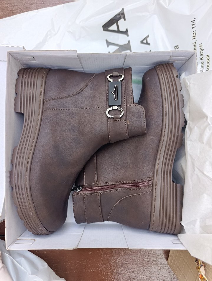 Kahverengi deri, kelepçeli ve kama topuklu kadın botları. Biker tarzında, rahat ve desensiz tasarım, günlük kullanıma uygun.