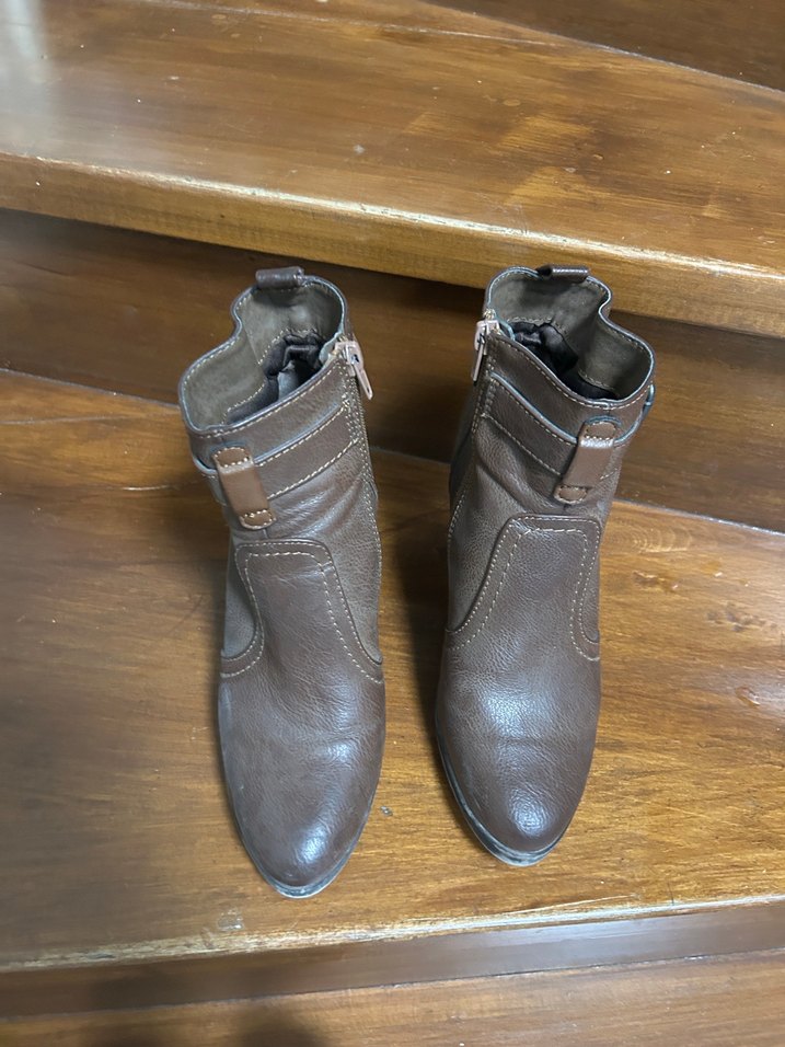 Kahverengi deri kadın bot, dolgu topuklu ve kemer detaylı. Minimalist ve bohem tarzda, günlük kullanıma uygun. 37 numara
