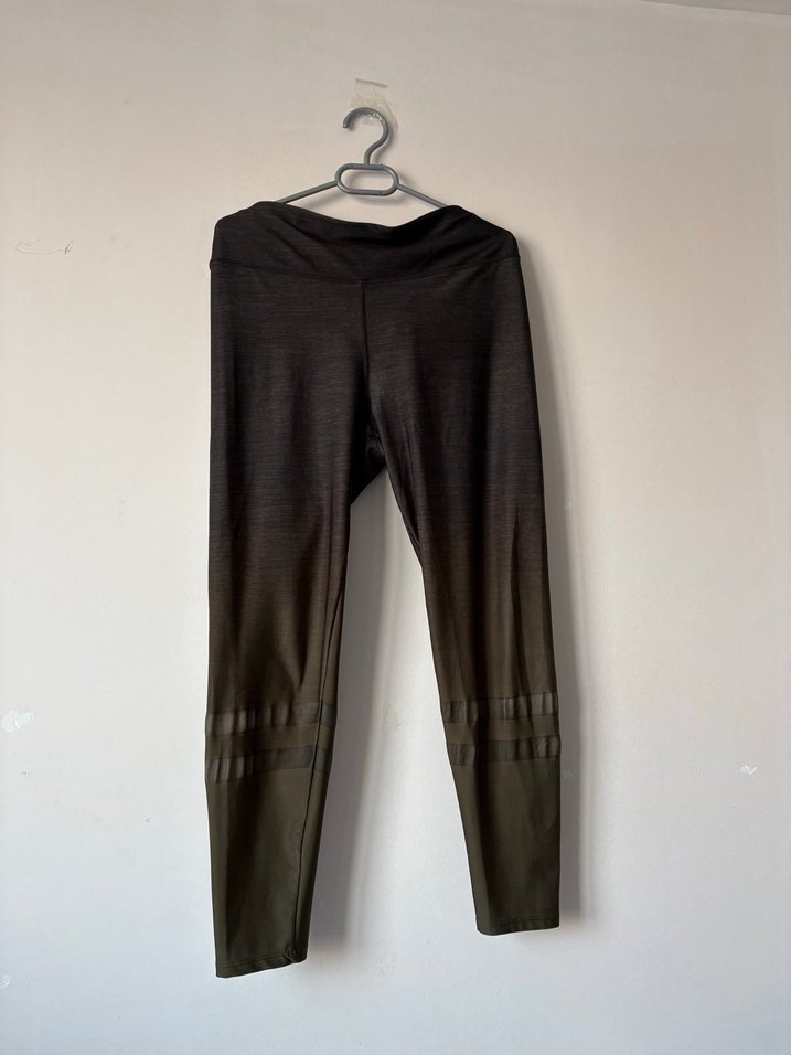 Kemerli bel detayı ve sentetik kumaştan yapılmış kahverengi yeşil geçişli, normal boy kadın taytı. Spor ve sokak modasına uygun midi uzunlukta. ♀️