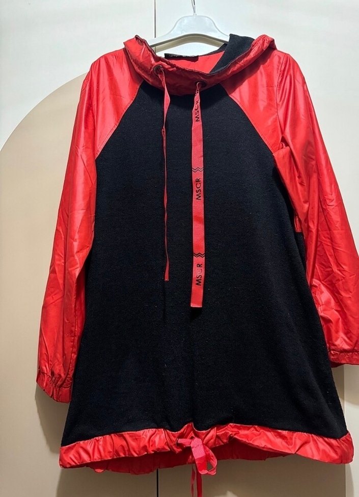 Kadınlar için uzun kollu, kapüşonlu, kırmızı ve siyah renkli sentetik kumaştan yapılmış, kemer detaylı, bol kesimli kısa sweatshirt.