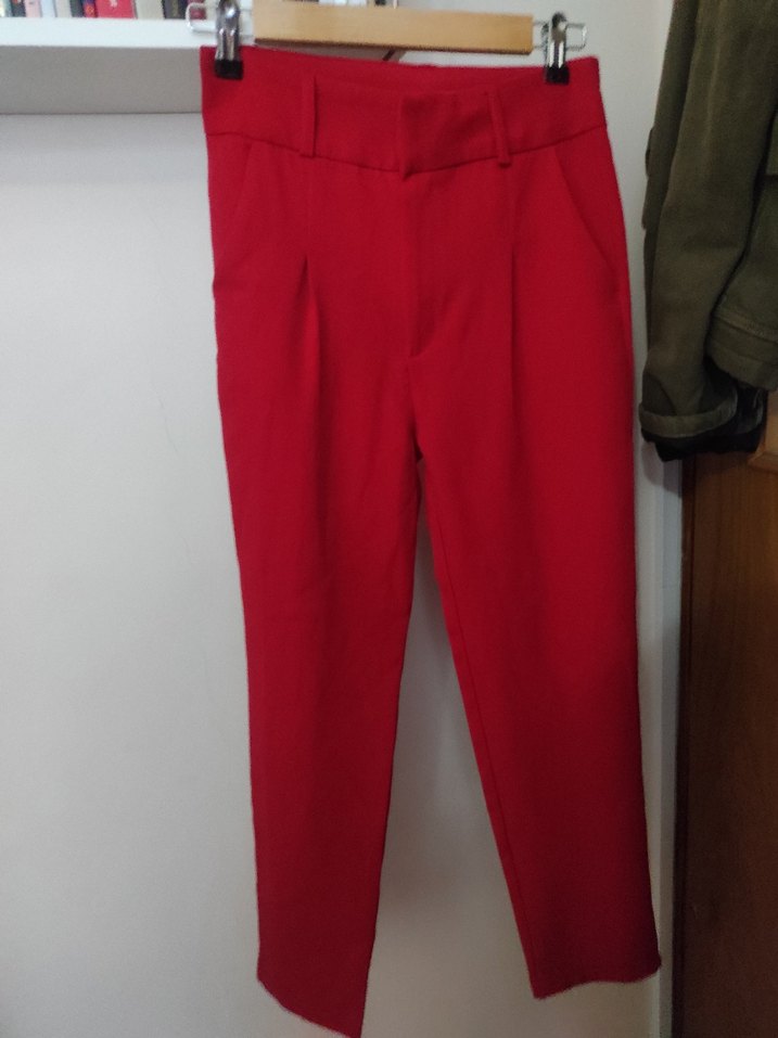 Kırımızı kumaş pantolon. Hiç giyilmedi çok eskiden almıştım ancak küçük geliyor. Yumuşak rahat kumaşlı. Dar kesim sebebiyle XS giyinlere anca olur.