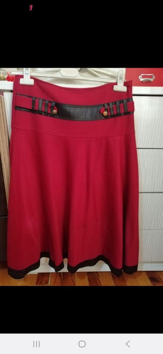Kemer detaylı, siyah şeritli koyu kırmızı midi uzunlukta, bol kesim sentetik kumaştan yapılmış etek. Günlük kullanıma uygun sade tasarım.