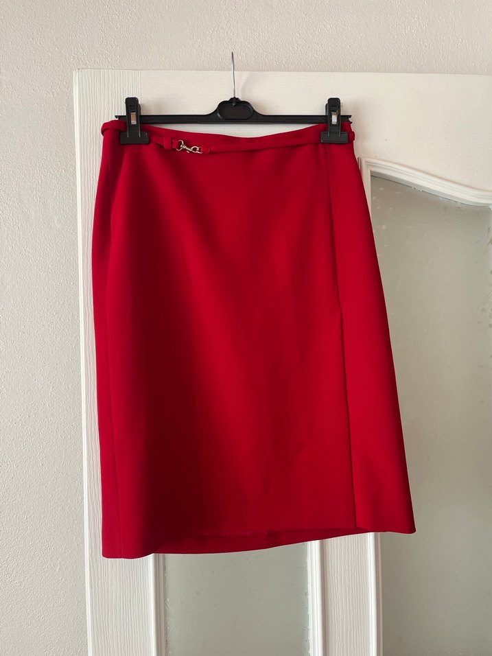 Kemer detaylı kırmızı midi etek, yumuşak ve sıcak kumaştan üretilmiştir. Düz, minimalist tasarıma sahiptir, ofis ve günlük kullanım için uygundur.