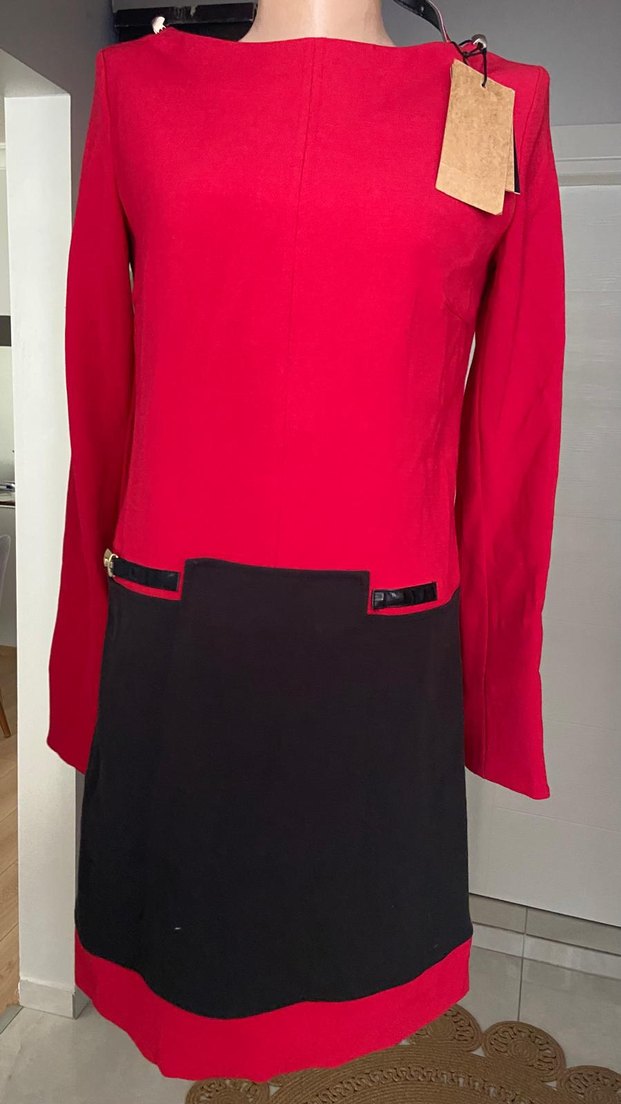 Uzun kollu, yuvarlak yaka ve kemer detaylı bu ofis elbisesi, koyu kırmızı ve siyah renklerde, normal kesim ve midi boyda, yumuşak ve sıcak kumaştan üretilmiştir.