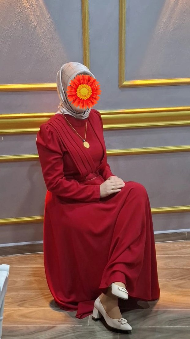 Kemer tokalı, yüksek yakalı, uzun kollu kırmızı uzun elbise.