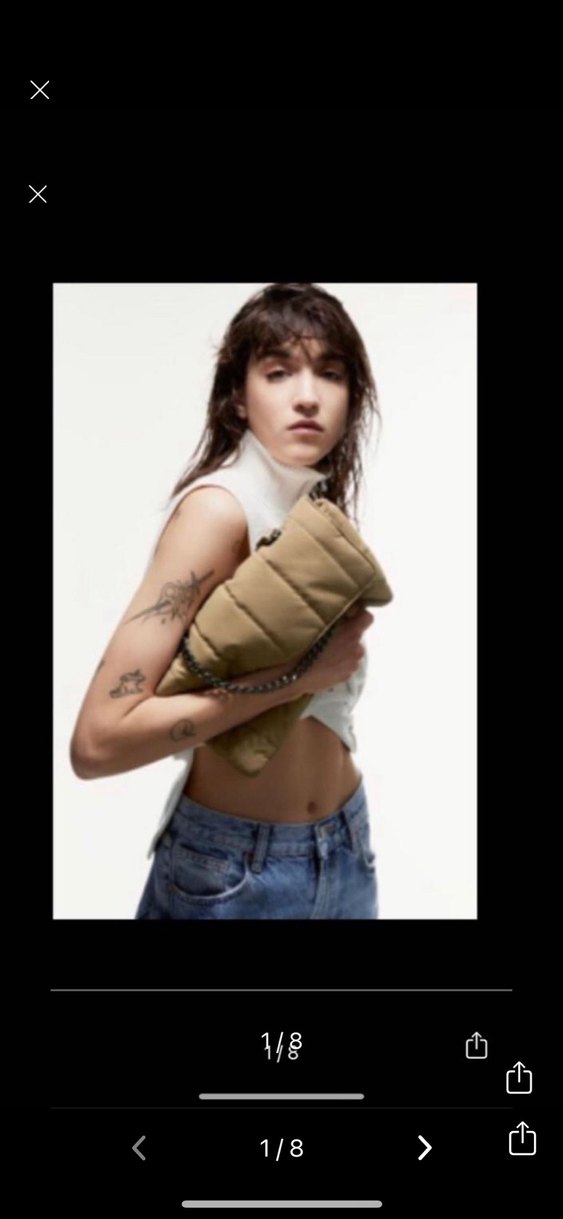 Kemer detaylı, straplez bej renkli kısa kesim şişme yelek. Denim kumaştan, kolsuz ve desensiz, günlük kullanım için uygun.