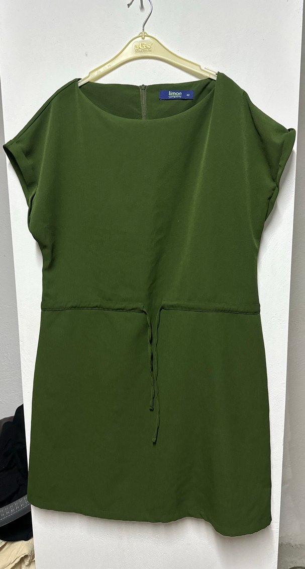 Kemerli bel ve kısa kollu, salaş kesim yeşil midi elbise. Minimalist sokak stili için uygun, dış mekan kullanımı için ideal.