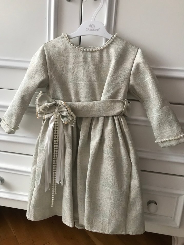 Uzun kollu, kemerli ve işlemeli detaylara sahip kız çocuk elbisesi. Normal kesim ve inci detaylı kemer bulunur. Özel dikimdir