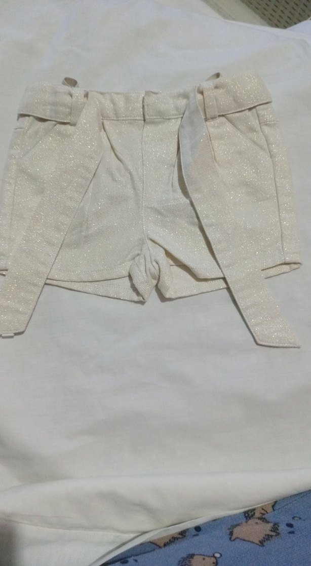 Kemerli, keten kumaştan yapılmış, beyaz ve vücuda oturan kız çocuk şortu. Sokak stiline uygun, hafif parıltılı kumaşla tasarlanmıştır.