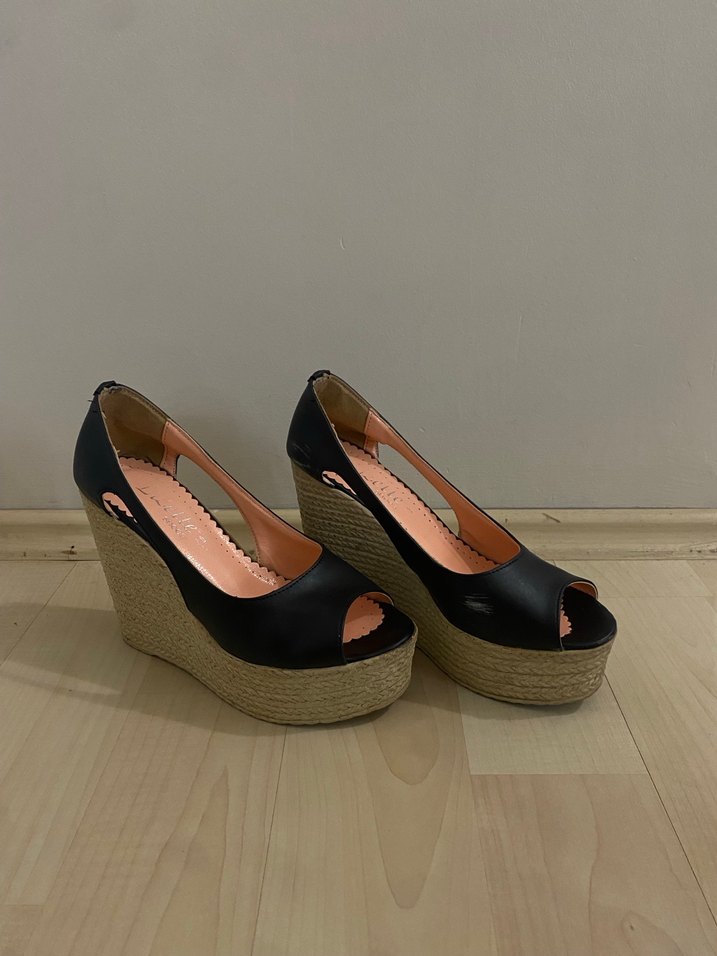 Kemer detaylı, kauçuk malzemeden yapılmış koyu bej renkte dolgu topuklu ayakkabılar. Günlük kullanıma uygun, desensiz ve çağdaş bir tasarım.