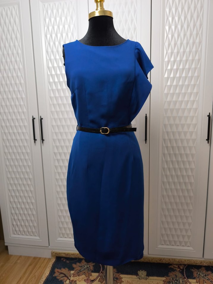 Kemerli, kolsuz ve tek renk koyu mavi midi kalem elbise. İpek gibi kumaştan, tekne yaka ve klasik şıklık sunar. Ofis için uygun, rahat kesim.