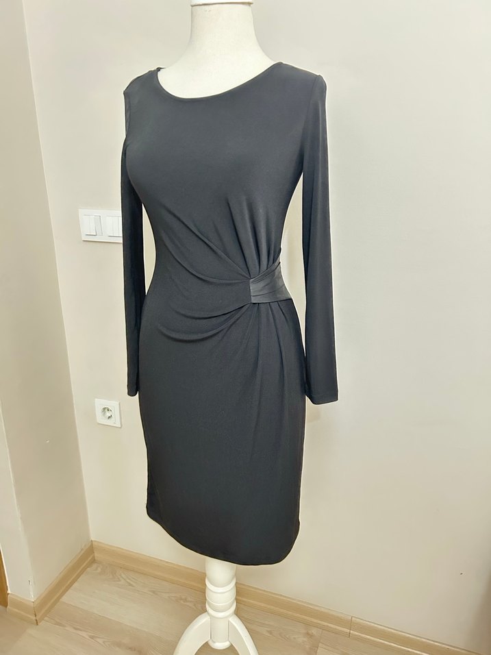 Kemer detayıyla bel vurgusu yapan, uzun kollu, yuvarlak yakalı klasik siyah midi elbisedir. Kumaşı penyedir.