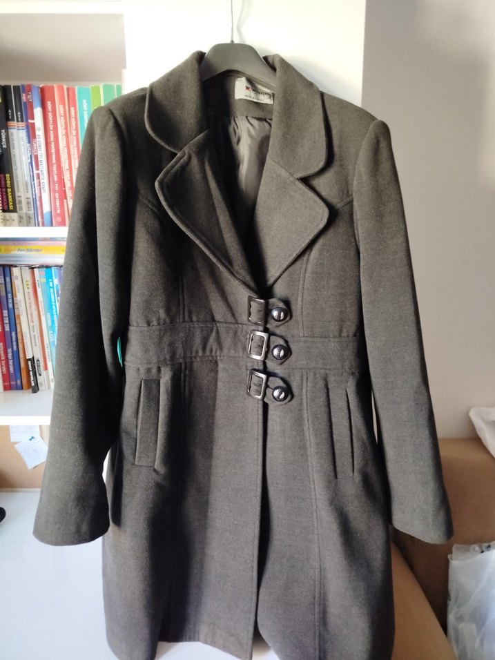 Yumuşak dokulu koyu gri kaban, geniş yakalı ve belde üç tokalı kapanışı bulunur. Uzun kollu ve ön cepli. bir defa tek kullanıldı 50 bedendir