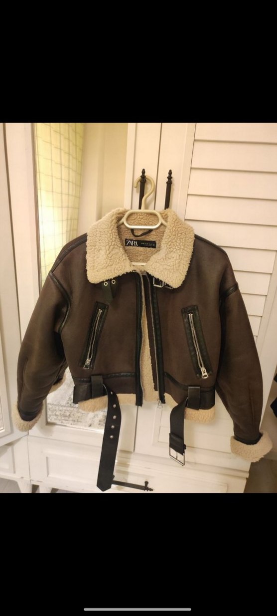 Kemer detaylı, kısa kesim koyu kahverengi deri ceket. Krem rengi yumuşak astar ve fermuarlı ceplere sahip, gündelik rahat stil için uygun.