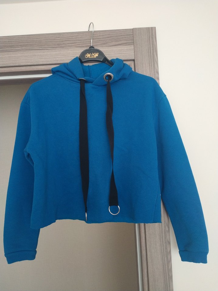 Koyu mavi kapüşonlu sweatshirt, bol kesim ve uzun kollu. Kemer detayıyla kısa boyda, yumuşak ve sıcak kumaştan üretilmiştir.