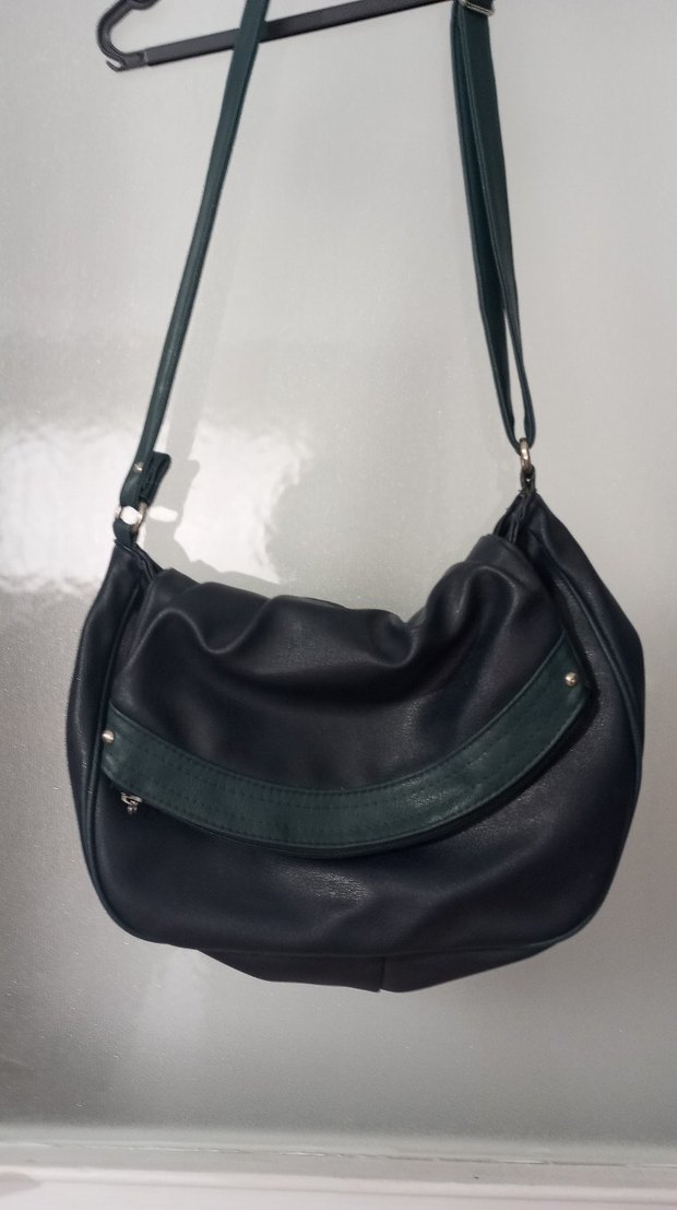 Koyu yeşil deri, kemerli detaylı, minimalist ve çağdaş tasarımlı kadın çantası, günlük kullanıma uygundur. Kapak kısmında astarında ve askısında ip söküğü var. Fermuar başı yok. Çantanın boyu:27 cm en:37 cm