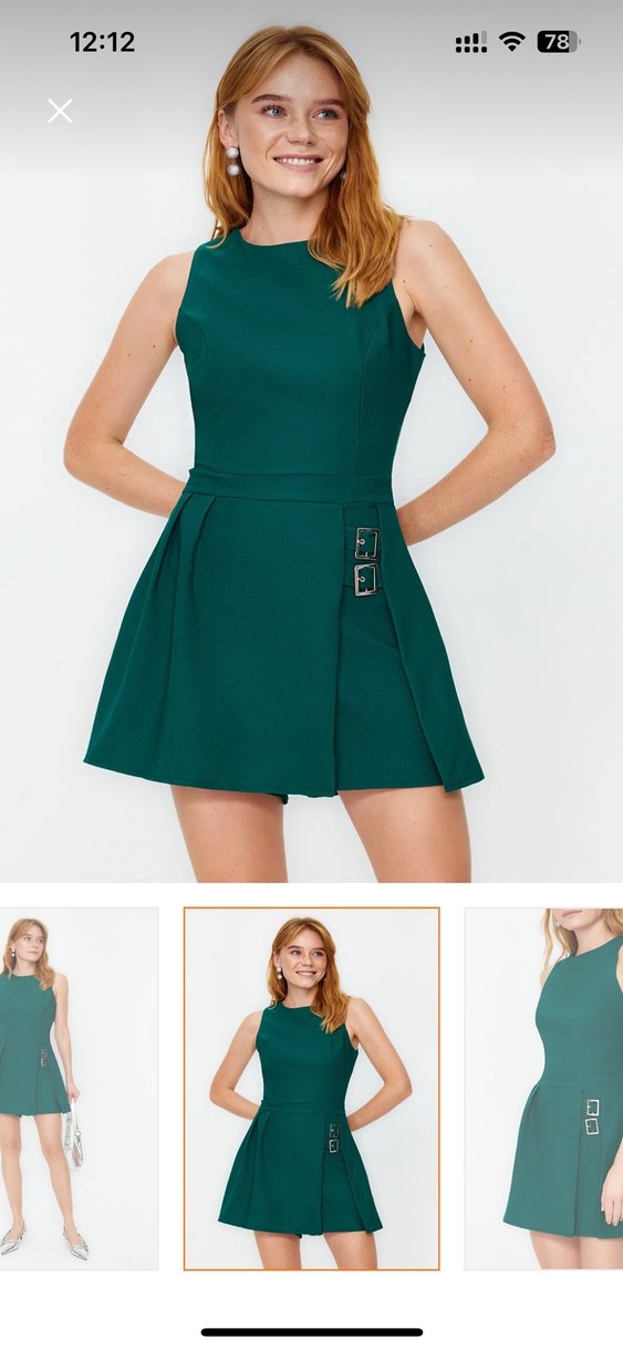 Koyu yeşil, kolsuz ve vücuda oturan bu mini elbise, çift tokalı kemer detayı ile minimalist ve cesur bir tarz sunar. Pürüzsüz sentetik kumaştan üretilmiştir.